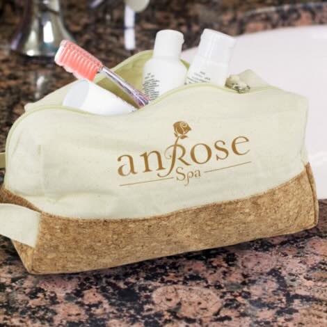 Smart toiletry bag which is manufactured from unbleached cotton canvas with a stylish natural cork accent panel around the base. It has a carry handle and a matching zippered top closure with a canvas zipper pull.