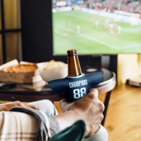 This fun stubby and can holder is made from 3mm neoprene. Easily customised to replicate your favourite sports team's jersey, it fits most stubby bottles and cans. It slips on easily and prevents cold, wet hands while keeping your drinks cool for longer. A production lead time of 25 working days applies to this product.