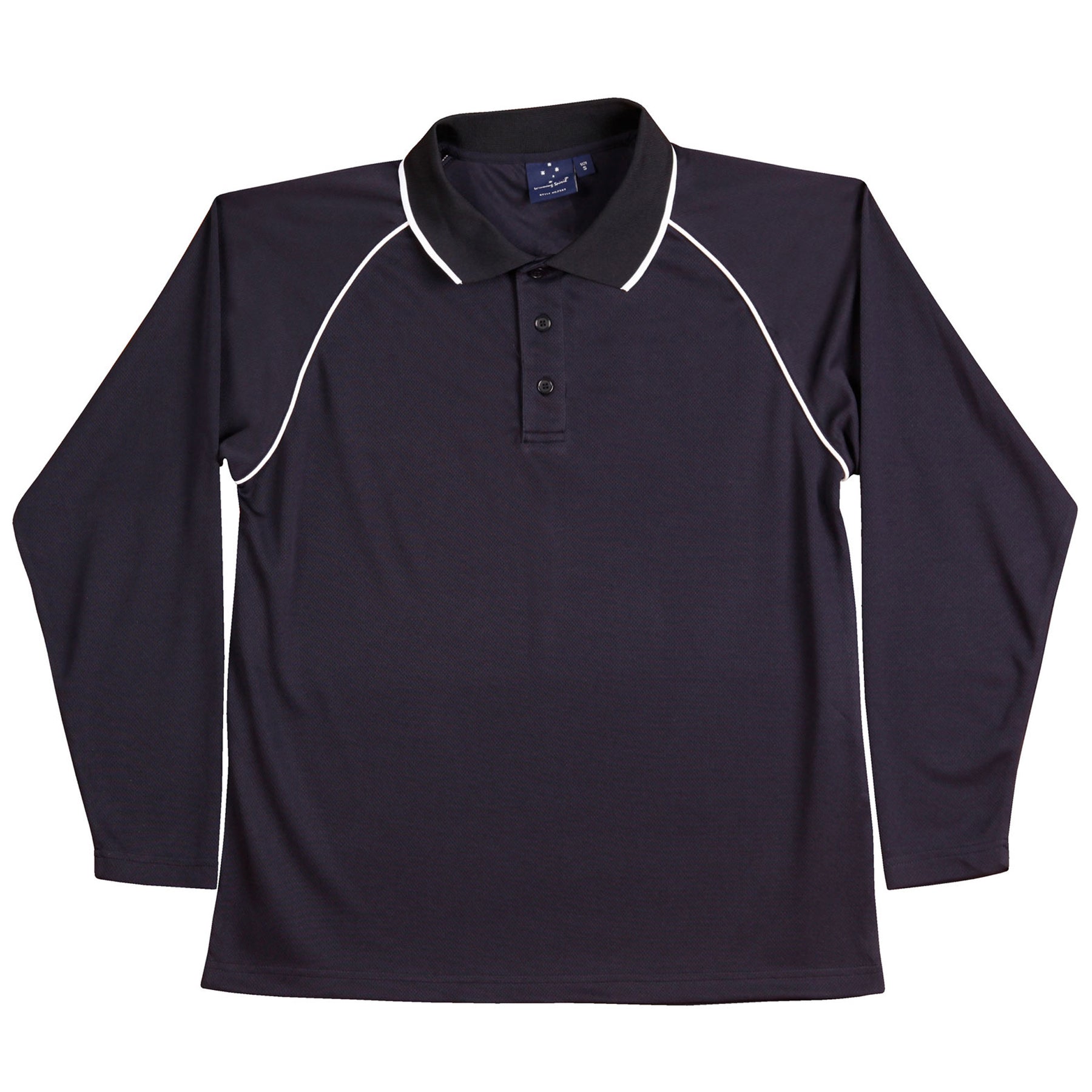 Description: Breathable diamond knitted fabric. Long raglan sleeves. Contrast piping on raglan sleeve seams and on collar.