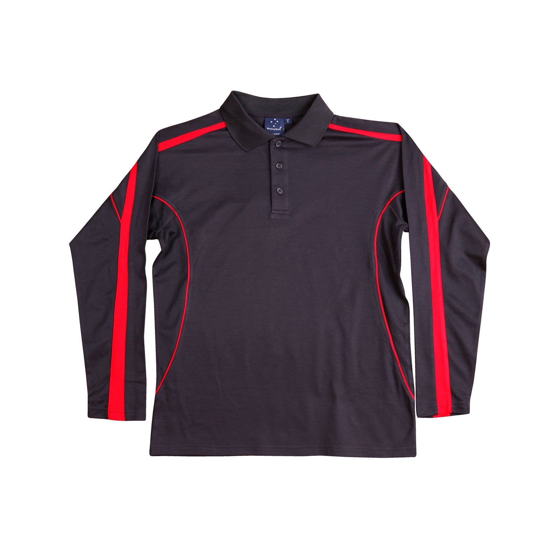 Description: Breathable mesh panels under arms & on sides. Long sleeves. Contrast panels and piping on shoulders and sleeves-front and back.
