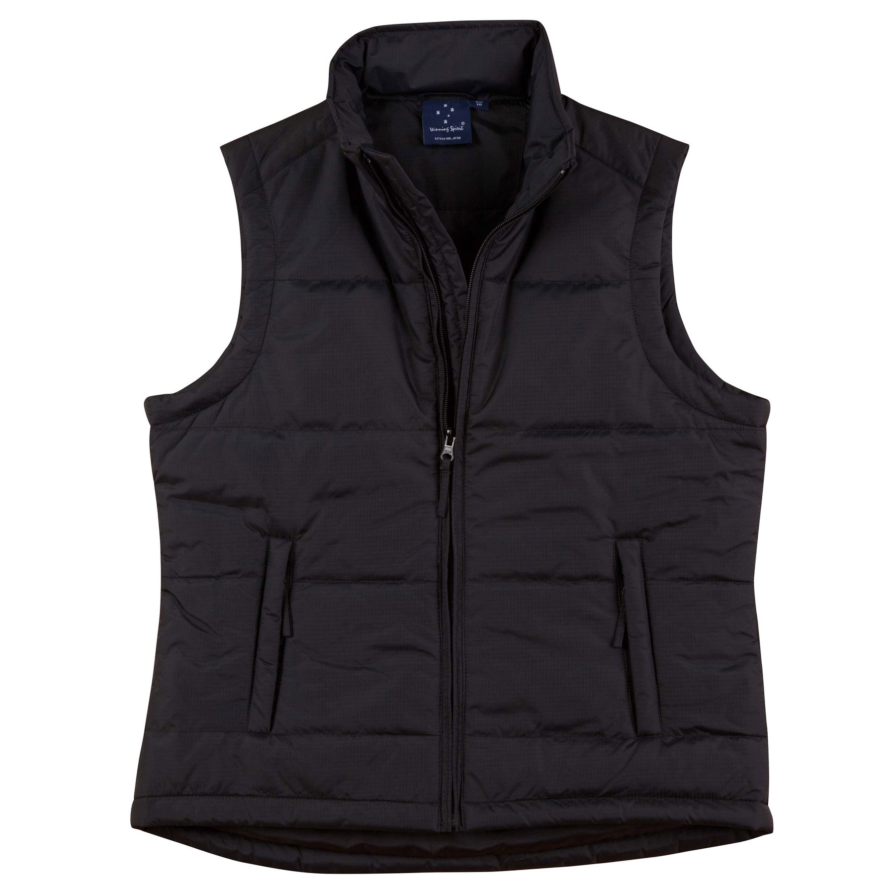 Fully lined & polyfill, full front zipper with tape puller, two zippered welt pockets, embroidery accessible at inner hem.